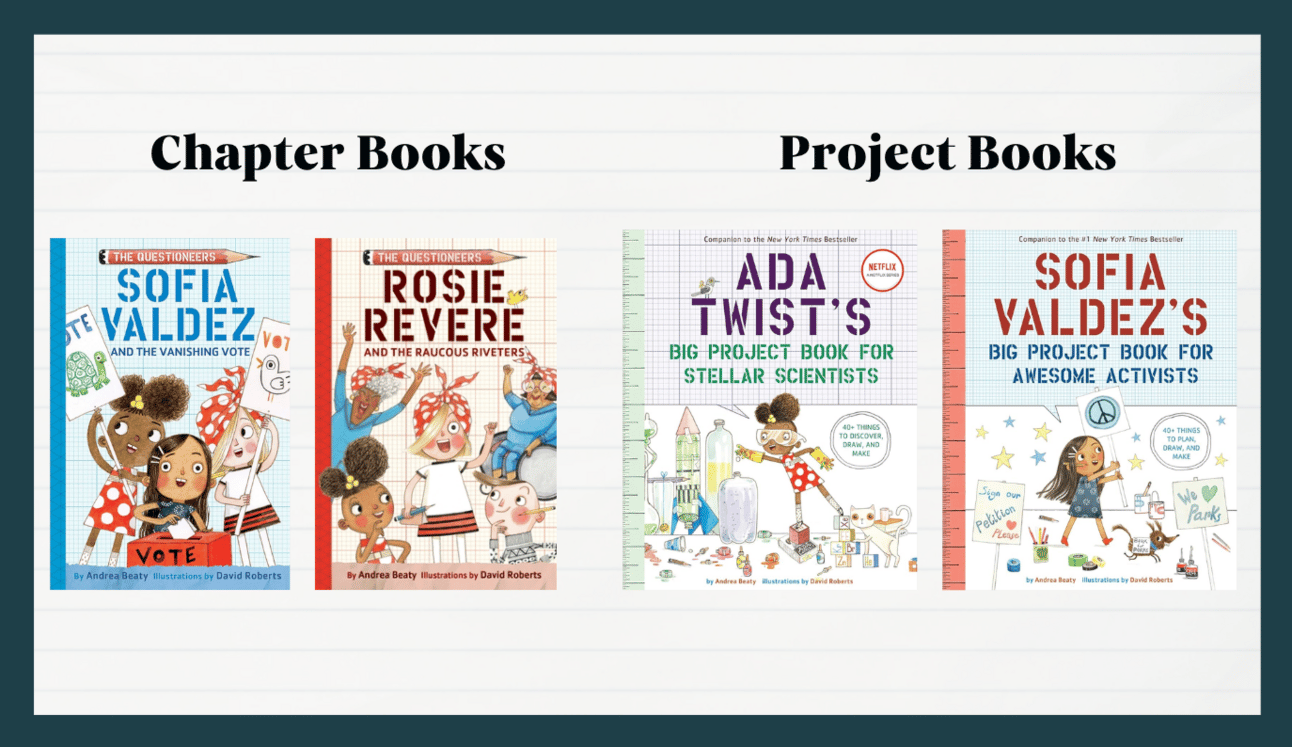 The Questioneers series offers more than just picture books. Each character has at least one corresponding chapter book to keep the adventure going. In Sofia Valdez and the Vanishing Vote, Sofia helps her class run a mock election to decide on the perfect class pet. Each character also has a project book which gives you ideas and activities to help readers explore the same passion as the featured character.